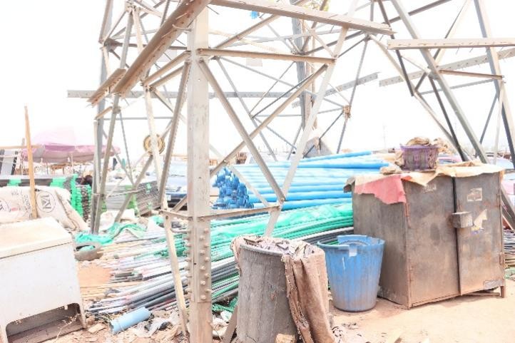 This area has been defaced with multiple Right-of-Way (RoW) violations at different locations. Beginning from Reka Bus-Stop, behind Afdin Petrol Station, there is a block-moulding site with heaps of sand and moulded blocks deposited at the base of the transmission tower posing significant safety and access concerns. Within the Basan Jiwa Community, there are numerous clusters of makeshift structures constructed with roofing sheets and sacks, being used for both residential and commercial purposes directly beneath the transmission lines and around tower bases. In some instances, tower members have been repurposed as laundry poles.